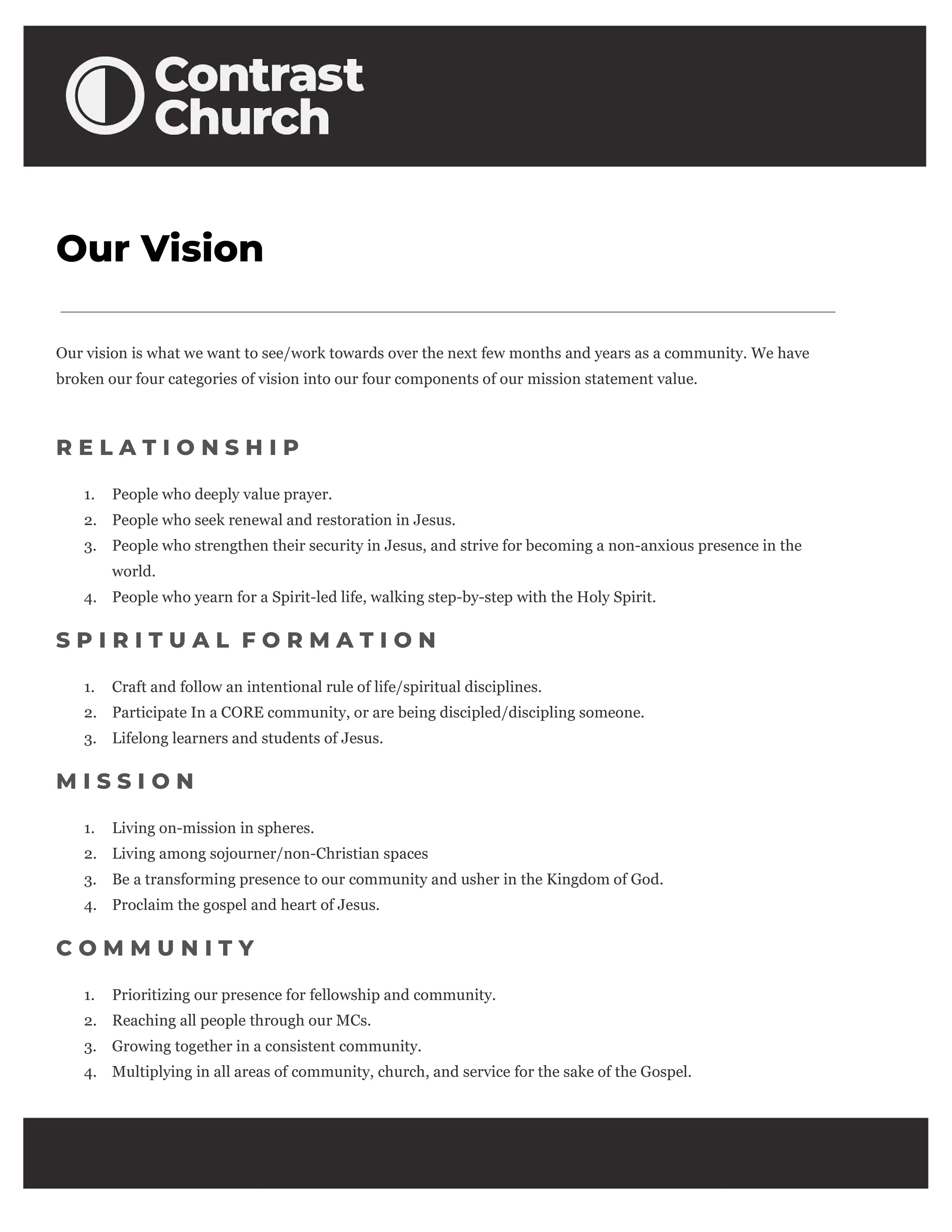 This week we discussed our Philsophy—Mission, vision, and DNA of Contrast Church. Below are three PDFS that briefly describe each one.